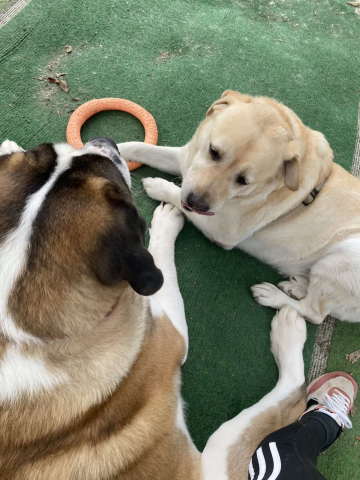 いつも”降参”の大きな相手を見下ろし、満足げです。) |
