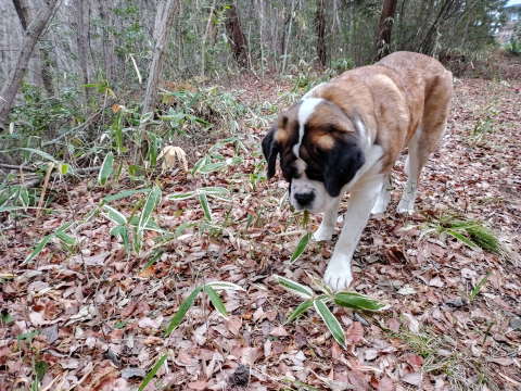 (胸やけがするのか、散歩の途中で笹の葉をかじります。